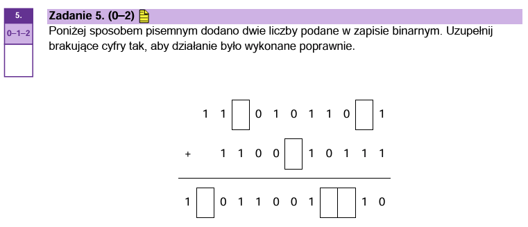 Co więcej, patrząc na zadanie 5 z matury z informatyki w 2025 roku, widzimy zupełnie nowy typ zadania. Zamiast klasycznego dodawania, odejmowania, mnożenia czy dzielenia dwóch liczb w różnych systemach, jak to bywało na wcześniejszych maturach, teraz mamy zadanie wymagające wstawienia w odpowiednie miejsca tych cyfr, które gwarantują poprawność obliczeń. W samym dodawaniu w słupku znajdują się luki – brakujące cyfry zarówno w sumowanych liczbach, jak i w wyniku.