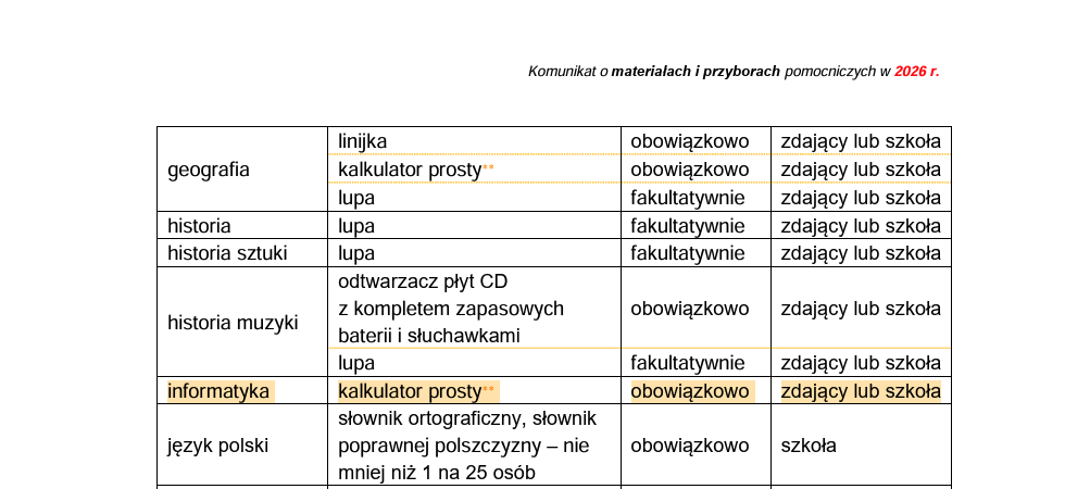 W komunikacie o materiałach i przyborach pomocniczych w roku 2026 nie są wymienione żadne pomoce dla egzaminu z informatyki w formule 2023."
